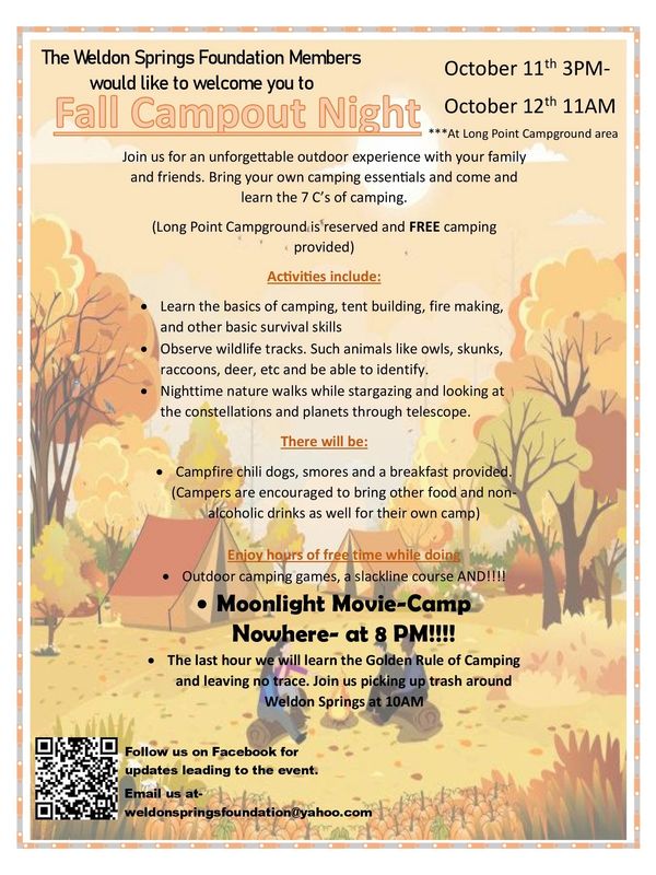 The first ever Fall Campout Night at Weldon Springs Oct. 11 and 12 was a chance for kids and adults to learn new camping skills, share stories and enjoy a night under the stars. Many thanks to Sara Tremble and her friends for organizing the event and preparing all the meals for the group.